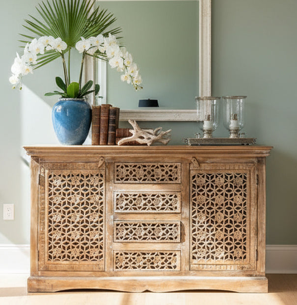 When done thoughtfully, blending vintage furniture with modern décor creates a home that feels full of warmth and character. The best interiors are rarely born from a single design era; instead, they tell stories through contrasting textures, layering, and emotion filled carved details. Vintage pieces bring history, soul, and artistry, while modern design contributes simplicity, lightness, and clarity. Together, they form a connection between the past and the present — one that feels rich, intentional, and intensely personal. Modern interiors often lean toward clean lines and minimalism, celebrating open space and neutral palettes. Vintage furniture, in contrast, invites warmth through patina, aged wood, and hand carved detailing. The challenge lies not in choosing one over the other, but in finding harmony between the two. When balanced, the carved wood furniture create a rhythm that feels organic — not chaotic — and infuses rooms with a sense of authenticity that purely modern or purely vintage spaces sometimes lack.