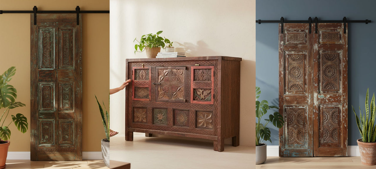 Looking for bespoke carved doors? Create personalized interiors with artistic carved doors & rustic antique doors sourced from India by Mogul Interior. The curated collection of restored antique doors & the vintage reclaimed wood doors are uniquely hand-carved by artisans inspired by the ancient architecture of India. Adorned with nature-inspired motifs, graced with ornate surrounds & lentils the vintage doors whisper stories of the past carrying with them beautiful energies.