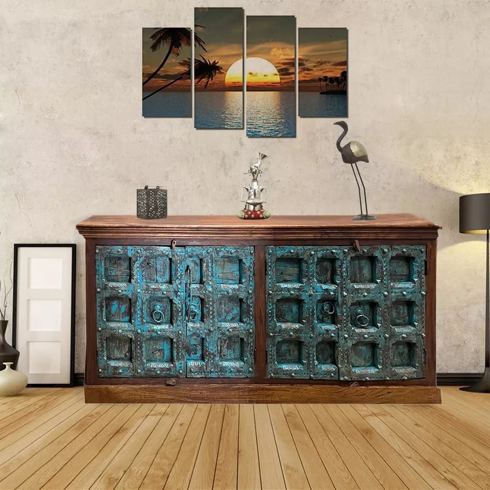 Rustic, handcrafted antique door sideboards, the reclaimed woods bring a warm, earthy aesthetic to antique armoires and bar cabinets. The unique artistry in these pieces often tells stories through intricate carvings, often inspired by tribal folk tales or nature motifs. The craftsmanship and history embedded in each antique armoire & credenza contribute to a sense of old-world charm while serving as practical storage solutions. The blend of earthy tones and natural textures creates furniture that feels grounded, with a sense of tradition, yet remains functional in modern interiors. These exotic sideboards can act as statement furniture in a moody, maximalist space, balancing artistry and utility