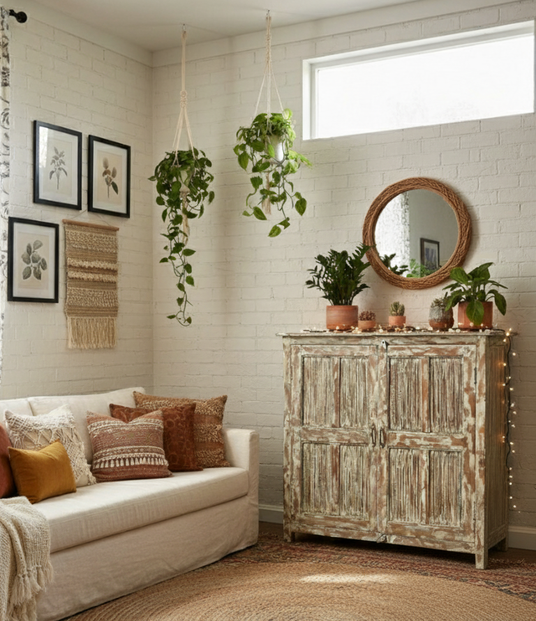 Step into a boho-inspired living space where history and craftsmanship whisper through every corner. At its center stands a vintage bridal chest — the Damchiya — adorned with intricate ethnic carvings and cultural motifs that echo distant lands. Handcrafted from reclaimed wood and aged to perfection, its rustic refined patina speaks of generations gone by. The ornate mid-door latch, sculpted brackets, and hidden storage blend function with artistry. Draped in rich textiles and surrounded by brass lamps and tribal accents, this antique trunk becomes a soulful centerpiece — a celebration of bohemian elegance that fills your home with warmth, nostalgia, and the beauty of handcrafted design.