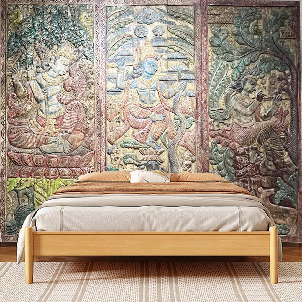 Graceful sari curtains, crafted from vintage textiles, drape in vibrant hues and lustrous textures reminiscent of royal courts. Whether gracing a window or serving as an elegant room divider, they bring a regal softness that draws the eye. Ornamental wall panels, inspired by nature’s harmony, turn bare walls into living canvases, rich with intricate artistry and timeless charm.