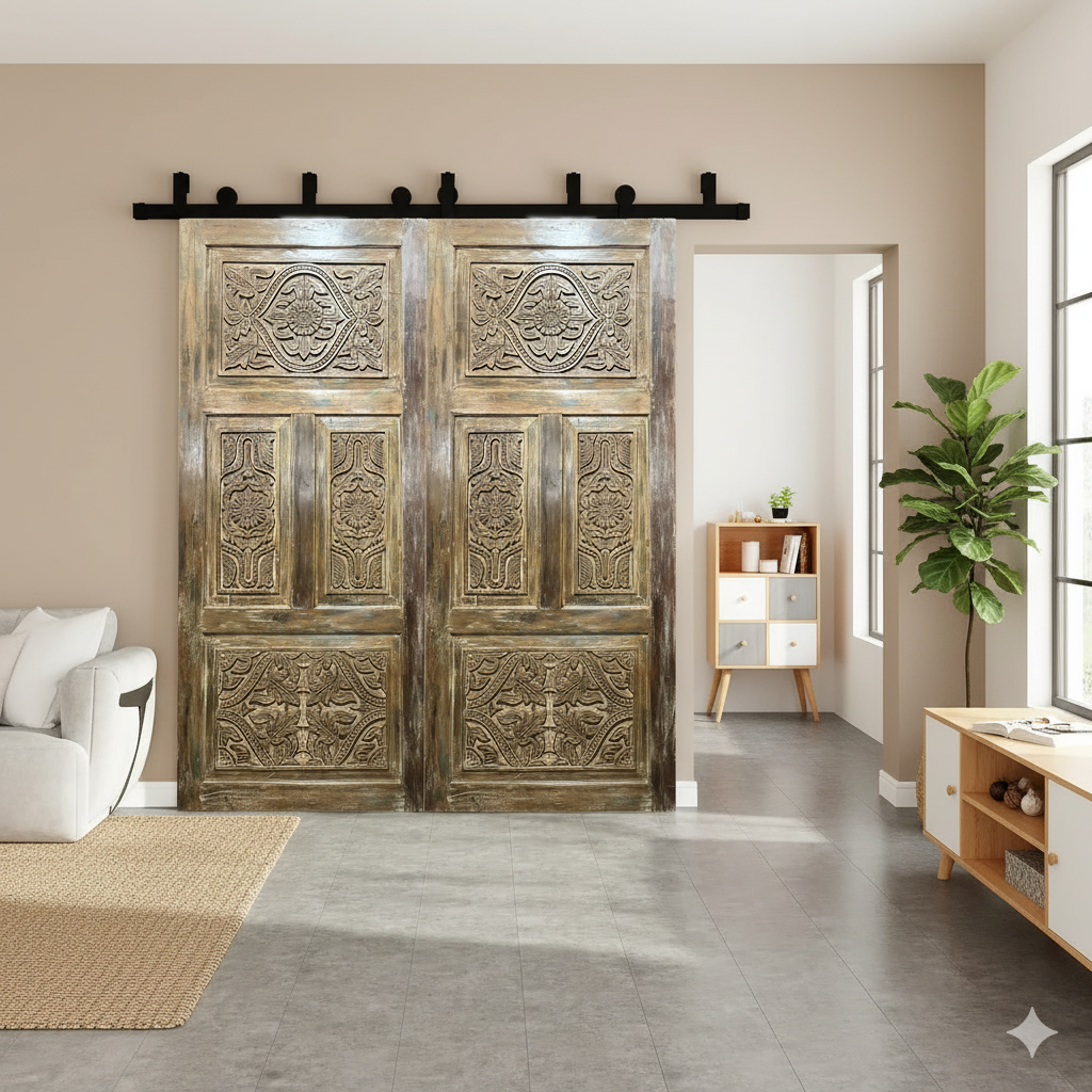 One of the most popular ways to showcase a vintage carved door is by transforming it into a sliding barn door. Perfect for open-concept living, sliding doors save space while adding visual impact. The hand-carved detailing becomes a focal point, and pairing the antique wood with modern steel hardware creates a balanced farmhouse-meets-industrial look.