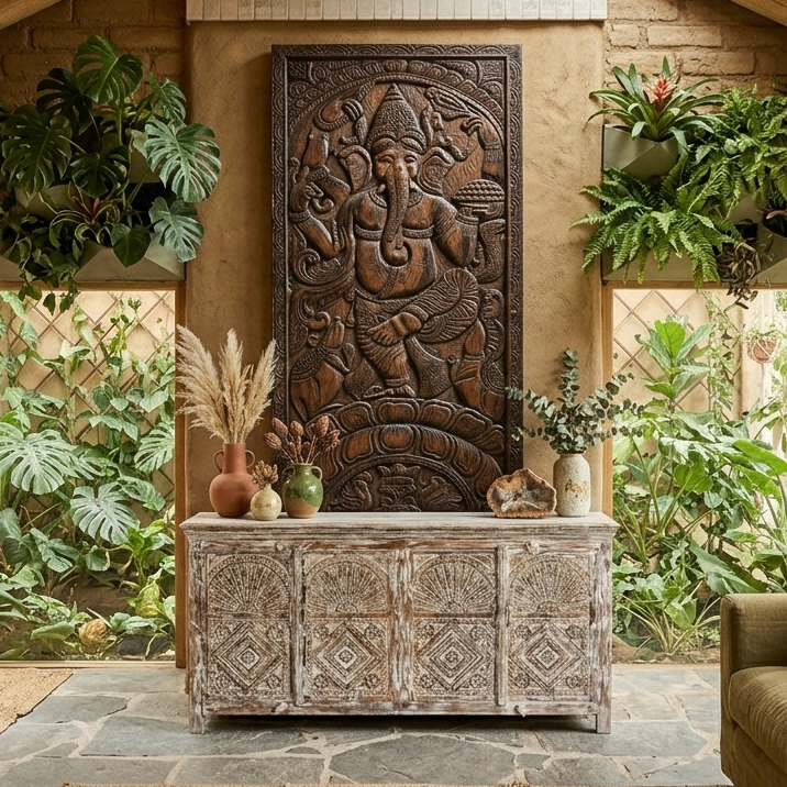 Let the spiritual in fully. A dining room is a place of gathering, nourishment, and communal ritual — which makes it entirely appropriate for objects that carry sacred meaning. A larger Ganesha on the sideboard surface, presiding over the room. A brass oil lamp. A cluster of crystals. Mala beads hung over the mirror above. These objects are not costume. In the tradition that produced the sideboard they rest on, they are the point — the acknowledgment that a beautiful home is also a spiritually intentional home, and that the objects we eat beside and gather around carry energy into every meal and conversation that takes place in their presence.