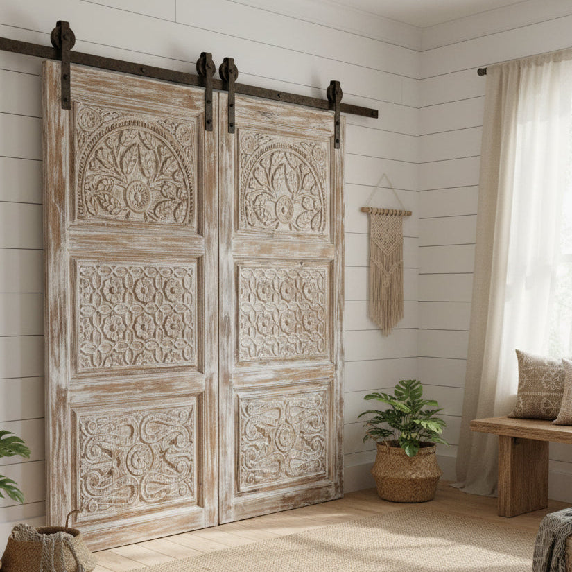 We connect with the universe through our spiritual body and the chakras that energize us, weaving a quiet mutuality that holds us as one complete being. Our home becomes an extension of this energy—every room, surface, and threshold echoing our inner state. A happy house truly creates a happy you. When chakras are thoughtfully integrated into the spaces we live in, balance unfolds naturally. Mogulinterior curates vintage carved doors, custom rustic designs, artistic barn doors, Indian doors, deity carvings, and wall sculptures crafted from reclaimed wood—pieces rooted in Mother Earth, carrying timeless stories, grounding energy, and a soulful connection to the universe.