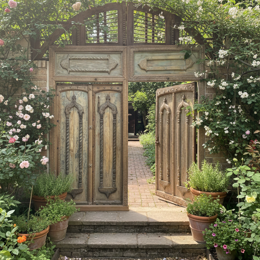 Organic modern style is where simplicity meets soul—a graceful dialogue between clean architectural lines and the grounding presence of nature. Imagine sunlight spilling across reclaimed wood doors, their timeworn textures whispering stories of heritage and craftsmanship. At Mogul Interior, our atelier collection of antique and rustic doors is thoughtfully curated to embody this harmony. Intricately carved with nature-inspired motifs—florals, vines, and sacred geometry—each piece becomes more than an entryway; it becomes art. The warmth of aged patinas, the quiet strength of solid teak, and the poetry of hand-carved details create a sanctuary that feels balanced, serene, and beautifully alive.