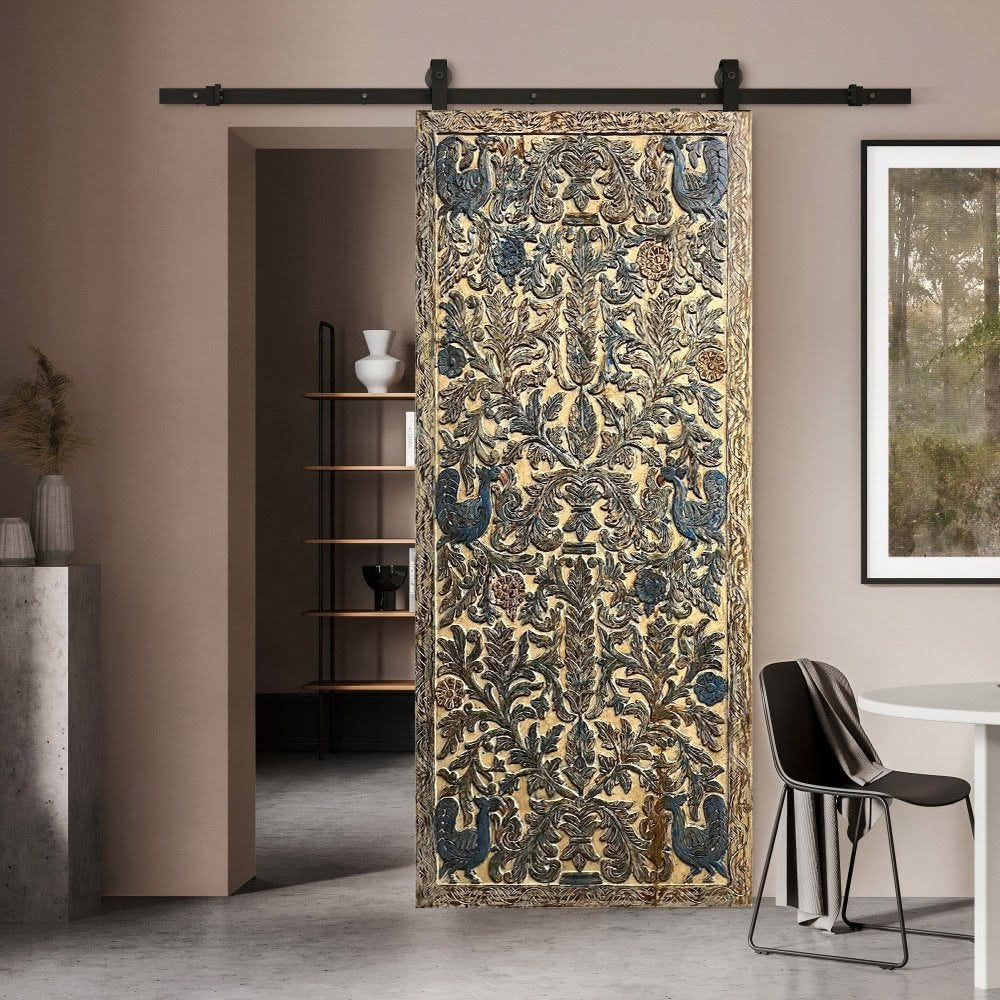 At the heart of this aesthetic are antique carved doors, often painted in shades of deep teal or weathered green. Salvaged from storied estates or crafted by skilled artisans, these vintage carved doors embody both sculpture and architecture. Their painted worn surfaces tell of generations past, while their jewel-toned hues bring unexpected depth to otherwise neutral farmhouse palettes. Positioned as bedroom doors, entryways, wall panels, or room dividers, they embody both weathered patina and eclectic poise.