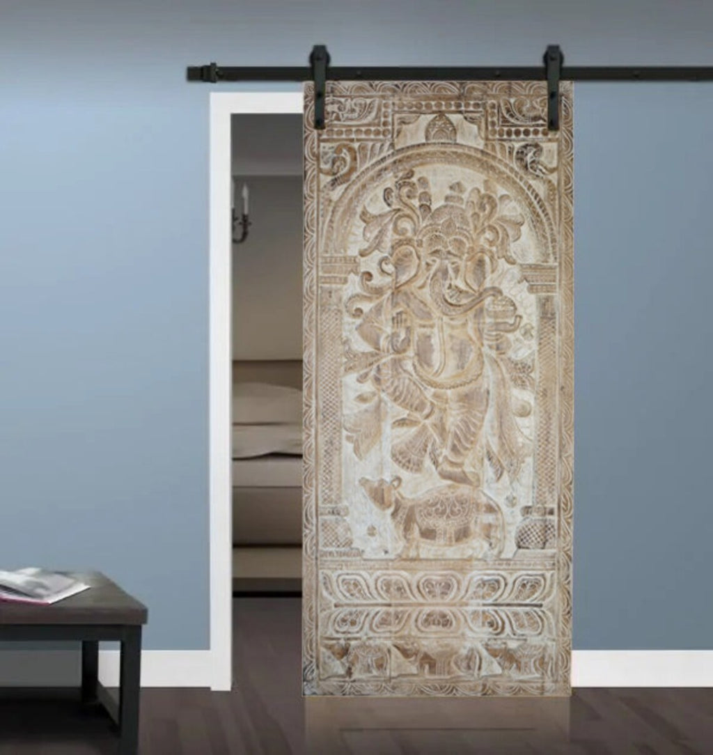 Vintage rustic carved woods provide a balanced contrast to modern gadgetry and sophisticated appliances, grounding the space with natural elements. Antique doors, repurposed as headboards or office entryways, feature ancient symbols of good luck and protection, while their patinas and studded metals echo stories of the past. This rustic sophistication of vintage carved doors at Mogul Interior combined with a relaxed return to basics and a connection to Mother Earth, is essential in creating a healing home.