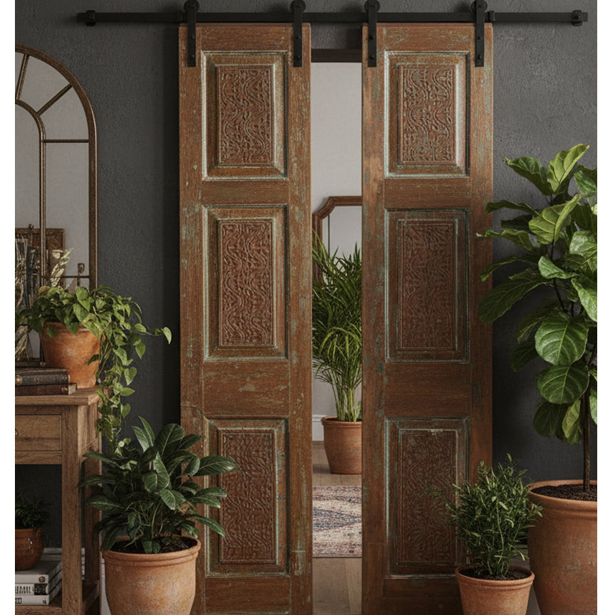 Did you come across these hand-carved Indian doors at a designer luxury home in Los Angeles, and then again during a walk through a restored hacienda in Santa Barbara—and you were so blown away with the extraordinary carved detail. The textured wood surface rippled with energy through layers of patina: coats of color revealing themselves, carved relief work catching light in ways that make shadows dance, brass hardware oxidized to shades of green and gold that no artisan could deliberately create. These intricately carved doors, salvaged from colonial-era buildings across India, represent a growing passion among homeowners and designers who understand that true luxury lies not in perfection, but in authenticity.