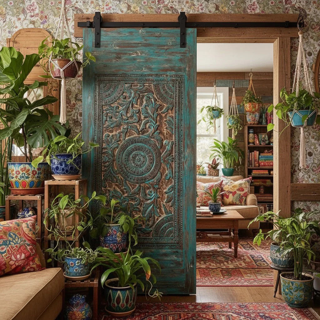 Surround your door feature wall with layered textiles, global artifacts, vintage finds, and lush potted plants. In maximalist design, more is always more—but the key is curating pieces that speak to each other through color, texture, or theme. Your vintage door becomes the hero, while supporting elements create a rich, immersive environment.