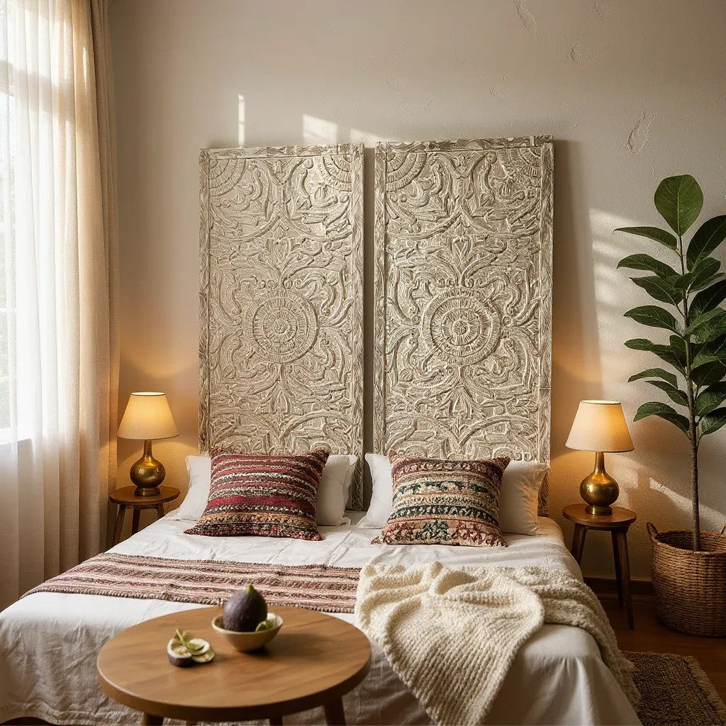 Bring coastal charm to life by weaving in accents of ocean blue and sea moss green. Add these refreshing hues through thoughtfully chosen details—toss pillows, breezy sheer curtains that sway like the ocean breeze, and handloom cotton table throws in ivory adorned with golden florals for a sunlit, beachy touch. Embrace tones of frothy blue, azure, teal, and muted greens that mirror the sea and its natural surroundings. For a striking focal point, hand-carved sliding doors painted in calming shades of blue tie the look together with effortless elegance.
