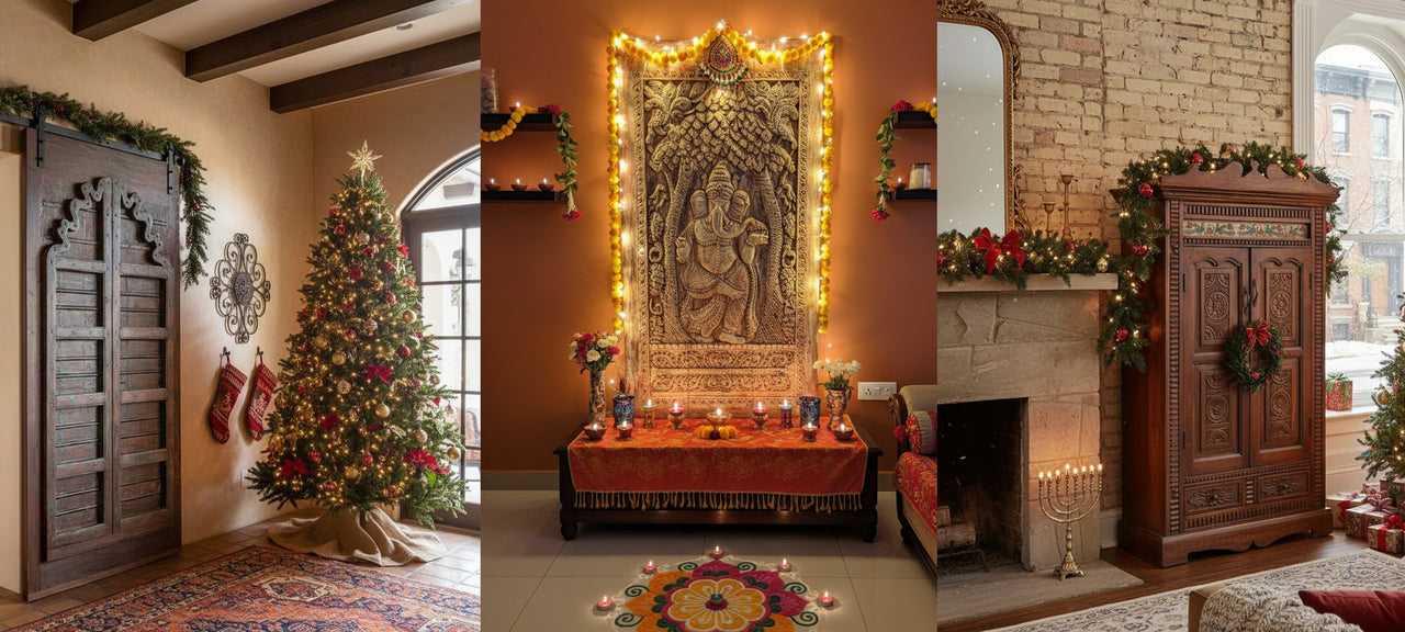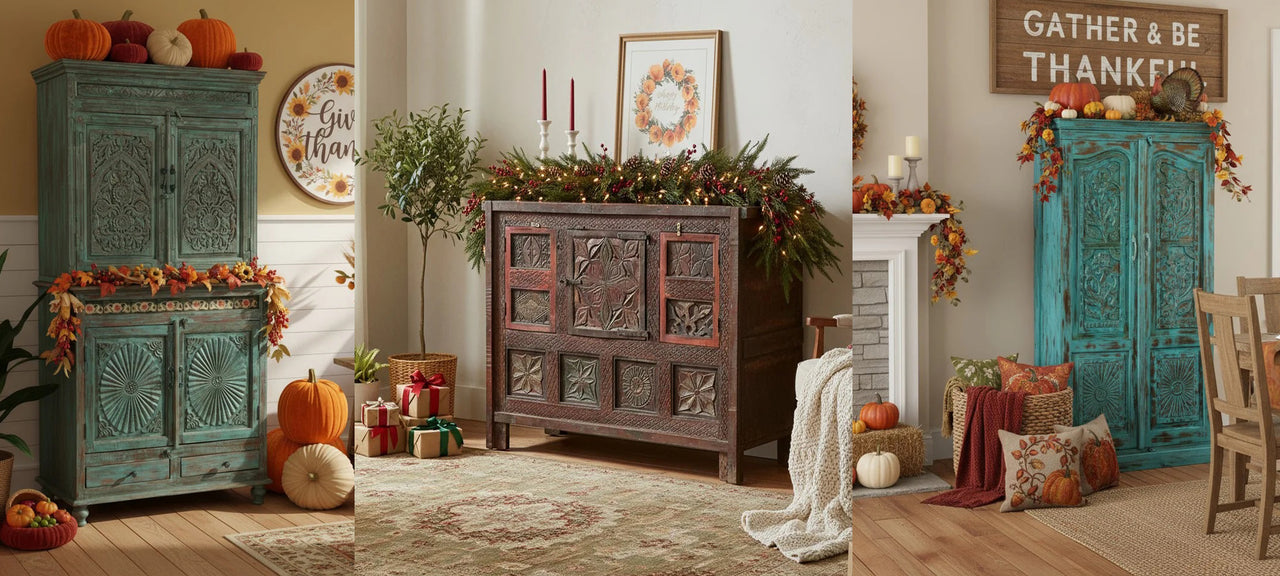The holidays are coming, the rustle of wrapping paper, the smell of warm cocoa, the excitement of visiting grandchildren, the holidays are a time for gathering, reflection, and celebrating the warmth of home. The holiday season transforms our homes into sanctuaries of warmth, light, and celebration. As we prepare to welcome loved ones and create cherished memories, the furniture and home decor pieces we choose to surround ourselves with become part of the magic. At Mogul Interior, we believe that carved wood doors, vintage armoires, antique coffee tables, and brass cladded sideboards don't just furnish a space—they orchestrate a symphony of beauty, history, and soul that resonates throughout the holiday season and beyond. There's something almost musical about carved wood doors. The rhythmic patterns etched by artisan hands, the interplay of light and shadow across intricate motifs, the way aged wood seems to hum with stories